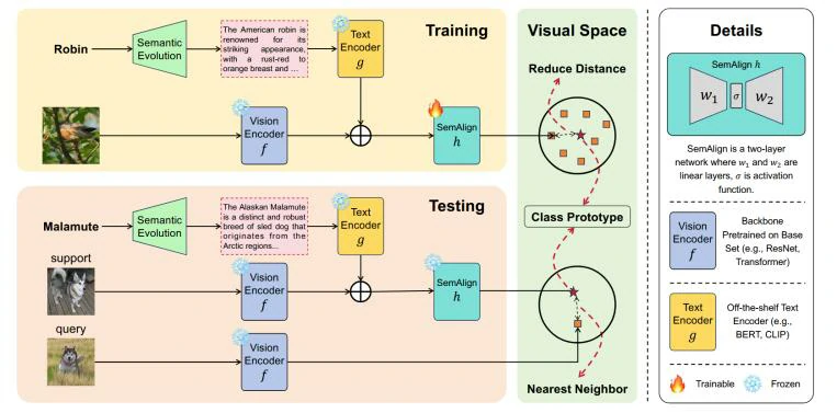 小样本学习(Few-Shot Learning)是一项旨在从有限数据中进行学习的计算机视觉任务,具有较高的挑战性。现有的一些小样本学习方法依赖语义信息以弥补数据稀少带来的特征不足。但传统的语义(如类名)容易引入偏差,且从外部知识库获取丰富语义成本较高。为此,本文提出了一种语义辅助小样本学习(Semantic-Aided Few-Shot Learning, SemFew)框架,通过语义进化(Semantic Evolution)自动生成高质量语义,减少对复杂网络结构的依赖;采用两层语义对齐网络(Semantic Alignment Network)将语义和视觉特征转换为具有丰富判别特征的鲁棒类原型。SemFew整体架构如图1。