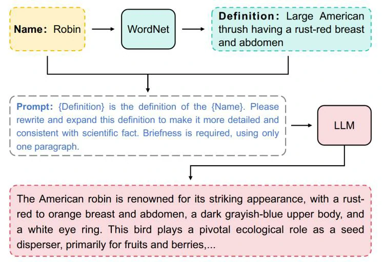 首先从词网(WordNet)中检索与图像内容匹配的类名定义,得到一段简短的描述,由于描述相对简短,可能会忽略关键的视觉信息,所以进一步利用预训练的大语言模型(LLMs),根据特定提示扩充定义,从而自动生成详细准确且不泄露信息的高质量语义,为后续分类任务提供更丰富的语义信息。图2为语义进化流程图。