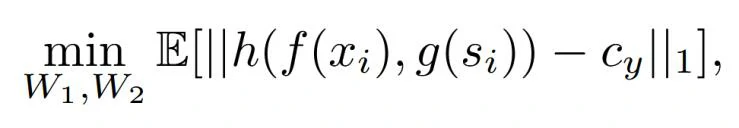 具体来说,假设数据集中的第i幅图像表示为xi,其标签和语义分别表示为yi和si 。首先,xi由一个视觉编码器f(如ResNet-12)编码,该编码器在基集上进行预训练。此外,语义描述si由现成的文本编码器g(如CLIP或BERT)编码。然后,将编码后的视觉特征和文本特征拼接在一起,输入到语义对齐网络 h中重构原型。其中h(f (xi), g(si)) = σ([f (xi) · g(si)]⊤W1)W2是具有可学习权重W1和W2的语义对齐网络h,语义对齐网络h的输出即为生成的重构原型,c为聚类中心,||⋅||1 表示 ℓ1范数,计算了SemAlign模型输出的特征与类中心 cyi之间的差异。