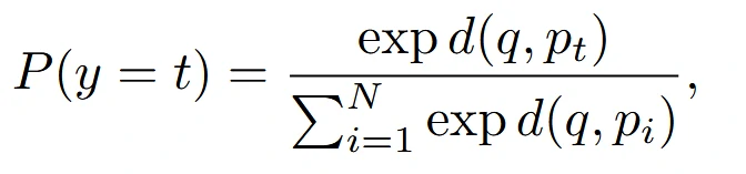 最后使用余弦距离计算查询样本与原型的距离,通过概率公式为查询样本分配标签,公式如下: