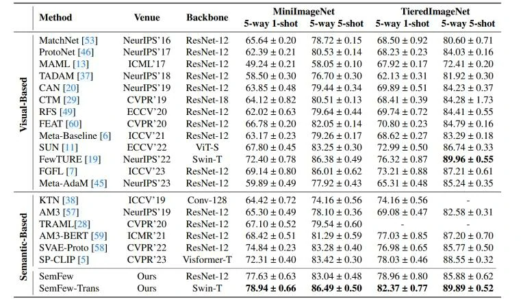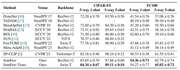 本文提出的方法与之前的方法在基准数据集MiniImageNet和TieredImageNet上的比较结果如图3,在基准数据集CIFAR-FS和FC100上的结果如图4,结果表明,本文所提出的SemFew方法在5-way 1-shot和5-way 5-shot设置下的分类性能优于当前的最先进方法。Places和CUB 是用于跨领域场景测试的数据集,本文的方法在跨域任务上也取得了显著的效果,结果如图5。综合表明,高质量的语义信息在少样本学习中能有效提升分类性能,即便使用简单的网络结构。