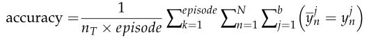 其中φ代表特征提取器参数,φ代表测量学习器参数。Argmin是指当以下公式达到最小值时,对φ和φ的值进行提取。nT = N × b表示目标集的图像样本总数。Yn是支持集合中每个类别的标签。Yj n为目标集图像样本的预测标签。同一匹配对的相似度为1,不同匹配对的相似度为0。MSRN是端到端的可微结构。采用反向传播算法和自适应矩估计调整参数值。在训练过程中,在一个Epoch(完成Epoch不同任务训练后)结束后,计算验证集上的准确率,并记录最高结果。当连续30个Epoch(或更多,根据特定条件进行调整)不是最优时,准确度被认为已经停止提高。在精度停止提高或开始下降之后,迭代可以停止。首先输出精度最高的模型,然后对模型进行的测试。精度计算公式如下: