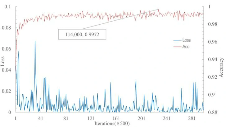 所有样本加工成28 × 28的尺寸。循环进行增强,随机选择1200、211和212作为训练集、验证集和测试集。结果表明,在5W1S实验中,当迭代次数为325000次时,该网络的准确率最高,达到99.76%。从图4可以看出,当迭代次数为时,在验证集上的5W1S实验中,MSRN的准确率最高,达到99.72%。