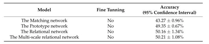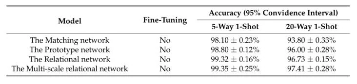 因此,对于5W1S实验,MSRN比关系网络更快地收敛到最高的精度。然而,验证集上的最高准确性略低于关系网络。训练后的模型在测试集上进行测试,结果如表1所示,置信区间为95%。在测试集上的5W1S实验中,MSRN的准确率高于其他三种方法。