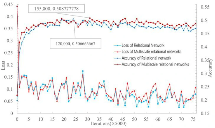 在5W1S实验中,当迭代次数为120,000次时,该网络的准确率最高,达到50.67%。另一方面,该方法在15.5万次迭代中达到了50.87%的最高精度。因此,对于5W1S实验,关系网络达到最高精度的收敛速度要快于MSRN。然而,在验证集上的最高精度略低于MSRN。从图5可以看出,关系网络收敛到最高精度后,随着迭代次数的增加,精度缓慢下降,损失减小。然而,当多尺度关系网络收敛到最高精度时,损失接近收敛。随着迭代次数的增加,损失逐渐减小到收敛,精度趋于稳定。损失收敛后,精度随迭代次数的增加而缓慢下降。