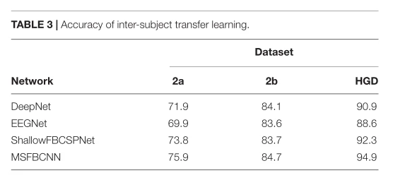(1)单个被试分类。是验证所提出的网络对单个被试的性能的一般基准。每个脑电数据集分为训练集、验证集和测试集。作者采用三个最先进的网络作为基线:DeepNet,EEGNet和ShallowFBCSPNet。所有方法都使用相同的通道。每个模型经过10次训练和测试后,收集每个网络的平均准确率。