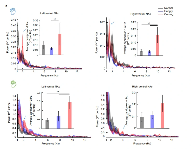 测试数据显示,当被试遇到他们很喜爱的食物时,大脑中NAc的低频振荡功率明显升高。并且问卷调查的结果也表明,此刻被试们确实很想大吃一顿。而在平时,包括当被试们遇到一般的食物的时候,他们脑子中的NAc区域并没有出现类似状况。