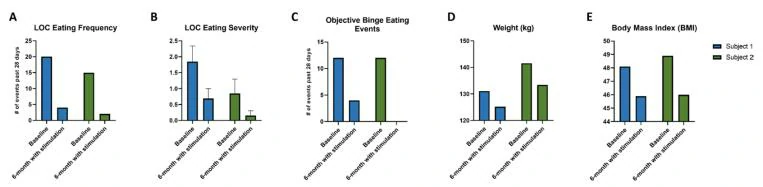 研究人员表示,这些设备似乎运行良好,没有发现任何不良反应。这两名被试都报告说,暴饮暴食的频率显著下降。平均而言,在接下来的六个月没有特别的饮食干预情况下,每位被试体重减轻了约11磅(10斤),BMI指数也向正常水平靠拢(BMI指数在18.5-23.9之间为正常),其中一位被试的暴食症最后甚至消失了。