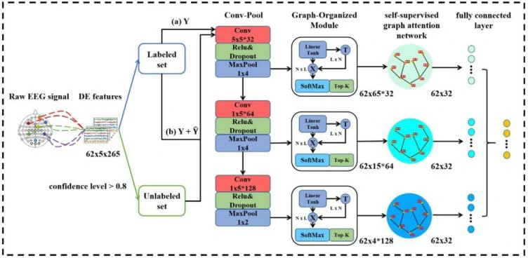 情绪是人类大脑的基本认知功能之一,在日常生活和辅助诊断各种情绪障碍方面具有重要作用,并且与意识水平密切相关。意识障碍患者意识水平的准确评估对其治疗至关重要,但现有基于行为量表和临床经验的评估方法误诊率较高。传统基于面部表情、语音和身体运动的情绪识别方法受文化背景影响较大,可靠性有限,且对残疾人的适用性较差。相比之下,基于脑电图的情绪识别方法更具客观性和准确性,因而受到广泛关注。基于脑电图的情绪识别方法可分为监督学习、半监督学习和无监督学习。监督学习依赖大量标记数据,但数据获取难度大、成本高;无监督学习虽然不依赖标记数据,但结果精度和可靠性较低,且难以解释;半监督学习结合了两者的优势,但在利用有限标记数据与大量未标记数据提升模型的跨被试情绪识别性能方面仍面临挑战。由于EEG信号的个体差异性,跨被试情绪识别模型的性能通常不如被试依赖模型。