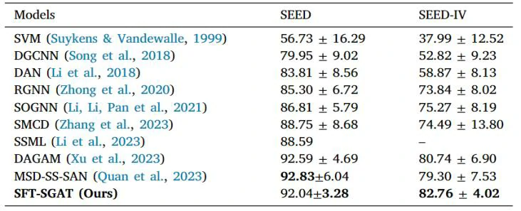 该论文提出了一种新颖的半监督-跨被试情感识别方法SFT-SGAT,通过在SEED和SEED-IV数据集上实现最先进的跨被试性能,并展示了其在意识障碍患者评估中的潜力。未来的工作包括在更广泛的数据集上验证方法的可行性,增加意识障碍患者的被试数量,并优化模型各组件的参数以提高其在多类任务和复杂场景任务中的鲁棒性。