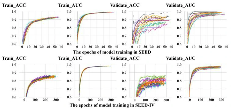 如表1所示,在SEED和SEED - IV数据集上,SFT - SGAT模型的跨被试情绪识别准确率分别为92.04%和82.76%,优于多种现有方法,且标准偏差较低。如图3所示,SFT - SGAT在SEED和SEED - IV数据集上结果随训练轮次的变化。两数据集轮次分别约60和300。SEED数据集在验证集ACC达0.85、AUC达0.96时开始半监督微调,此时训练轮次约15,后续半监督训练中验证集和测试集的ACC和AUC上升。SEED - IV数据集在半监督微调阶段将验证集ACC阈值降至0.8,AUC不变,此阶段开始时训练轮次约100,半监督训练中验证集和测试集的ACC和AUC也上升。总体上,训练约三分之一轮次用于第一阶段,三分之二用于微调,微调时测试集准确率呈锯齿状上升。
