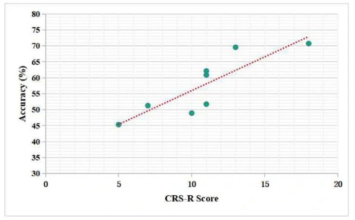 如图4和图5所示,在自采数据集上,对健康受试者的情绪识别准确率为79.81% - 95.84%,平均准确率为87.45%,对部分意识障碍患者也能实现较高的情绪识别准确率,且情绪识别准确率与患者的CRS - R分数呈正相关。