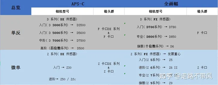 - 镜头群分为:Z卡口 全系统(全画幅 / APS-C )都可用;Z卡口DX系列 仅适用于APS-C上。