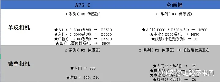 - 全画幅(FX)分成:D600和D700系列的入门款、D800系列的专业款、个位数系列的旗舰款。