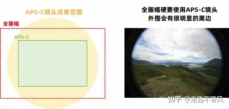 由于APS-C的感光元件较小,使用全画幅的镜头成像时,有很大一部份的影像会无法被记录、相当浪费和可惜(如下图左),因此为了让APS-C的使用者能更加便于携带镜头,各厂商都有推出专属APS-C的镜头群,用来满足APS-C 的感光元件尺寸(如下图右),由于成像圈变小,不仅可以将镜头口径缩小、重量也能达到更轻量化。