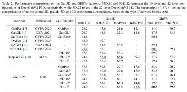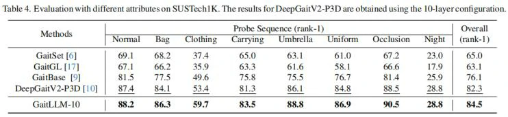 作者主要在 Gait3D、GREW、CCPG 和 SUSTech1K 四个主流步态识别数据集上对所提出的GaitLLM进行了全面评估。如表2、表3和表4所示,GaitLLM在多个测试条件下均取得了优于现有方法的结果。在 Gait3D 数据集上,基于10层DeepGaitV2-P3D的基线模型Rank-1准确率为67.4%,而GaitLLM提升至74.1%,mAP达到60.1%,均显著优于基线。在 GREW 数据集上,GaitLLM的Rank-1准确率为71.2%,比基线提升2.2%,进一步验证了其在真实场景下的泛化能力。