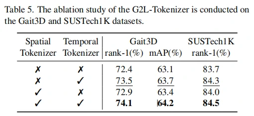 为了解决这些问题,本文提出了一种新的步态识别方法GaitLLM,核心在于通过两个关键模块实现步态序列与LLMs的有效结合。步态到语言模块(G2L)将步态特征转换为“步态句子”,利用空间与时间双重Tokenizer去除冗余并提取关键动作片段,使步态数据能够以语法形式输入LLMs;语言到步态模块(L2G)则将LLMs处理后的高层语义特征映射回步态特征空间,并与原始步态特征融合,实现身份判别特征的增强。通过冻结预训练步态编码器和LLMs,仅需训练少量参数即可完成适配。GaitLLM在SUSTech1K、CCPG、Gait3D和GREW四个主流步态数据集上均取得了优于现有方法的性能,验证了将语言模型引入步态识别的有效性与潜力。