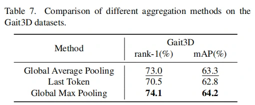 表示聚合器(RA):通过全局最大池化操作,将序列token聚合为判别性强的步态特征表示: