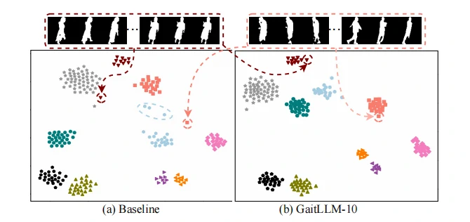 在图3的t-SNE可视化结果中也可以直观地看到,GaitLLM-10能够有效减小类内差异,提高类间可分性,验证了模型在表征学习方面的优势。