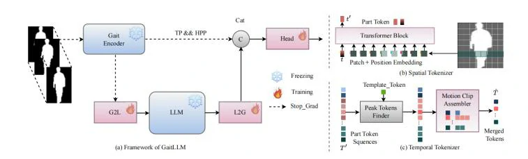 当前基于序列的步态识别方法在建模时序依赖方面取得了进展,但它们通常依赖复杂的网络结构设计,且容易受限于特定数据集,难以充分捕捉长时序和全局的动态特征。此外,步态序列是连续的非语言信号,与自然语言模型的输入形式存在差异,直接利用大语言模型(LLMs)进行建模存在挑战。