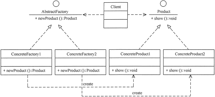 class ConcreteProduct1 implements Product { public void show() { System.out.println("具体产品1显示..."); } }