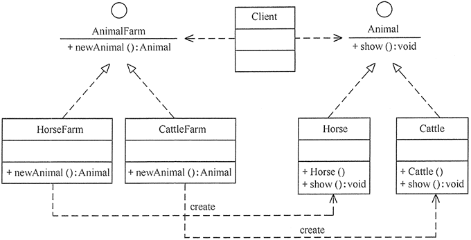 class CattleFarm implements AnimalFarm { public Animal newAnimal() { System.out.println("新牛出生!"); return new Cattle(); } }