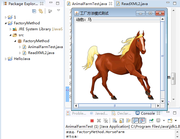 class Horse implements Animal { JScrollPane sp; JFrame jf = new JFrame("工厂方法模式测试"); public Horse() { Container contentPane = jf.getContentPane(); JPanel p1 = new JPanel(); p1.setLayout(new GridLayout(1, 1)); p1.setBorder(BorderFactory.createTitledBorder("动物:马")); sp = new JScrollPane(p1); contentPane.add(sp, BorderLayout.CENTER); JLabel l1 = new JLabel(new ImageIcon("src/A_Horse.jpg")); p1.add(l1); jf.pack(); jf.setVisible(false); jf.setDefaultCloseOperation(JFrame.EXIT_ON_CLOSE); } public void show() { jf.setVisible(true); } }
