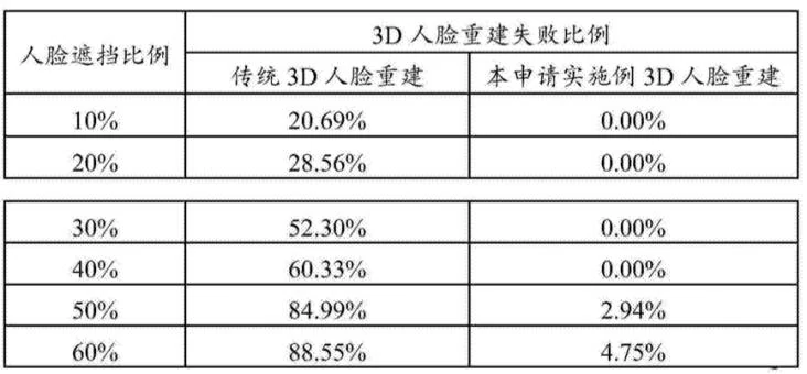 由于该方法是根据人脸局部特征进行三维重建,因此该方法针对人脸发生部分遮挡或大角度姿态发生自遮挡的情况能够重建出具有较好效果的三维人脸模型。下表展示了用离散随机事件模型仿真的方法估算人脸发生不同比例的遮挡时,传统三维人脸重建与使用该方法进行三维人脸重建的失败的比例。可见,提出的方法实现三维人脸重建具有更好的鲁棒性,相比传统的三维人脸重建,在不同的人脸遮挡比例下,重建失败比例都偏低,尤其是当人脸遮挡较大情况下重建失败的比例仍然较低。