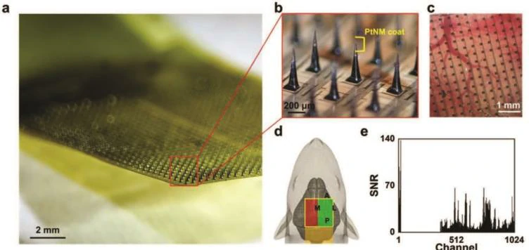 此外,软背脑机接口的制造方式允许更大的传感表面,这意味着可以同时监测更大的大脑表面区域。在高级功能材料论文中,研究人员证明了一个具有 1,024 根微针的穿透式微针阵列成功地记录了由大鼠大脑的精确刺激触发的信号。与目前的技术相比,这代表了十倍的微针和十倍的大脑覆盖面积。