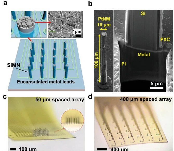 新型大脑传感器背衬的灵活性、更大的微针阵列足迹、可重构性和透明性都归功于研究人员使用的双面光刻方法。从概念上讲,从刚性硅晶片开始,该团队的制造工艺允许他们在刚性硅晶片的两侧构建微观电路和器件。一方面,在硅晶片的顶部添加了一层柔韧的透明薄膜。在该薄膜中,嵌入了钛和金的双层迹线,使迹线与在硅片另一侧制造针的位置对齐。从另一面开始,在添加了柔性薄膜之后,所有的硅都被蚀刻掉了,除了独立的、薄的、尖的硅柱。这些硅尖柱实际上就是微针,它们的底部与在硅被蚀刻掉后留下的柔性层内的钛金迹线对齐。这些钛金迹线通过标准和可扩展的微细加工技术进行图案化,从而以最少的人工劳动实现可扩展的生产。制造过程为数以万计的微针提供了灵活的阵列设计和可扩展性的可能性。