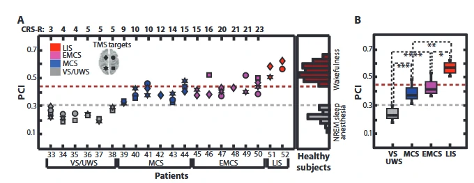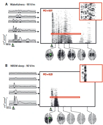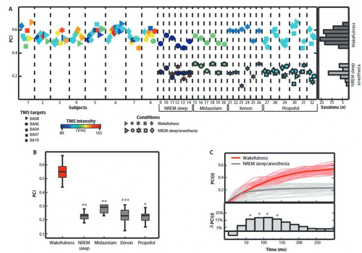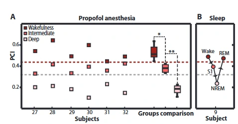 健康受试者(32人):在清醒、做梦、NREM睡眠、不同麻醉水平(Midazolam、Xenon、Propofol)状态下测量PCI。