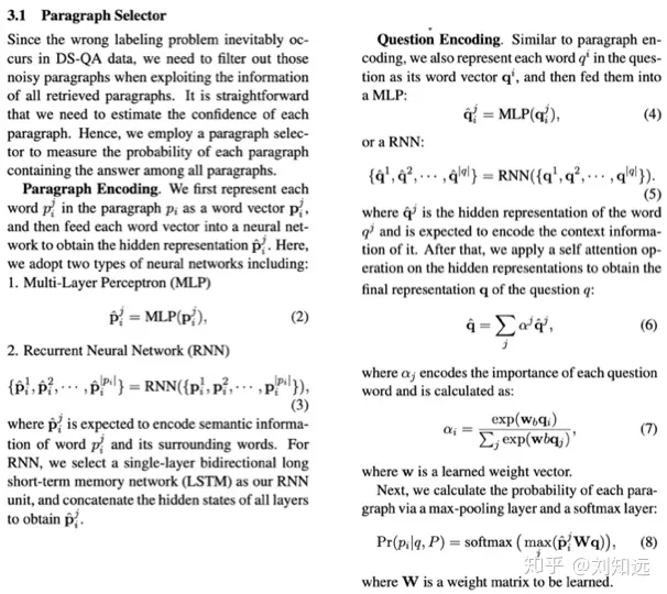然后进入”分“的部分,则需对应”总“中的框架,分别介绍各关键模块/步骤。例如,论文[2]的Methodology”分“的部分,就包括3.1 Paragraph Selector、3.2 Paragraph Reader、3.3 Learning and Prediction。读者在”总“的部分已经对方法有全景式的了解,有的放矢,就比较容易理解每个模块的具体细节。而每个”分“的部分中,又可以进一步采用”总-分“结构进行介绍,例如3.1小节做完总体介绍后,又会按照Paragraph Encoding和Question Encoding分别介绍。为了更清晰地体现”总-分“结构,可以将各“分”的部分命名并加粗。