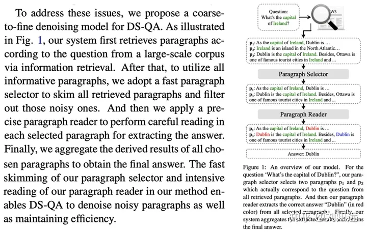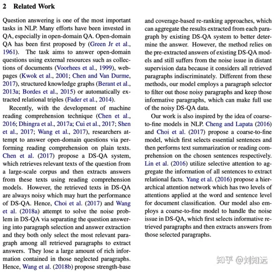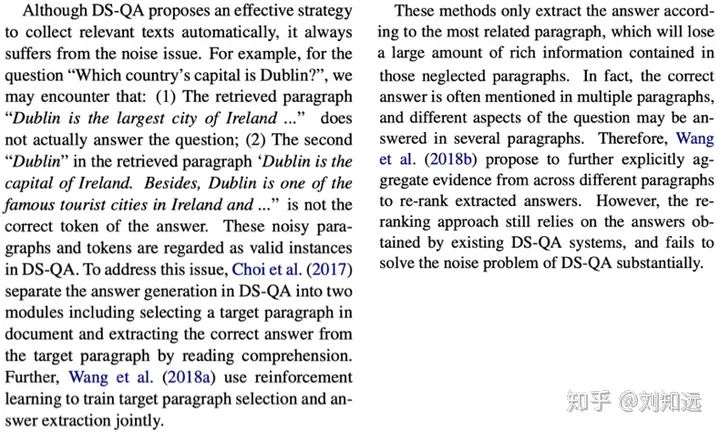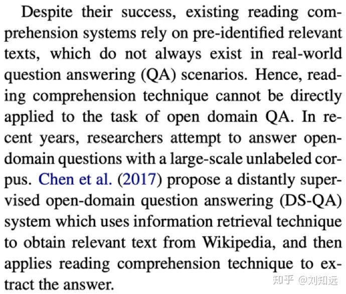 (2)已有方法。从研究任务递进一步,介绍这个任务的已有代表方法。如下所示论文[2]的第2段,开始介绍DS-QA。需要注意,这个已有方法需要是目前最好、最具代表性的,也是本文工作准备改进的。所谓站在巨人的肩膀上,一篇值得发表的论文需要找到那个最高的巨人。
