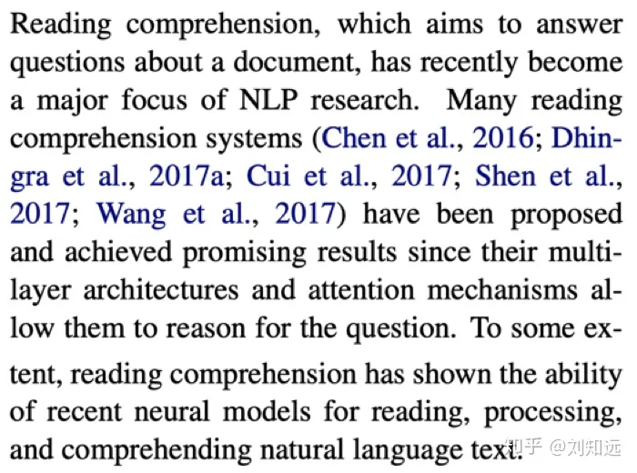 (1)研究任务。介绍本文的研究任务及其在该研究领域的重要价值和意义。如果是领域公认的重要任务的话,则可以不用详细论述其研究价值/意义;如果是新提出的研究任务,则需要花费比较多篇幅论证该任务的价值。如下所示论文[2]的第1段集中说明阅读理解研究任务。