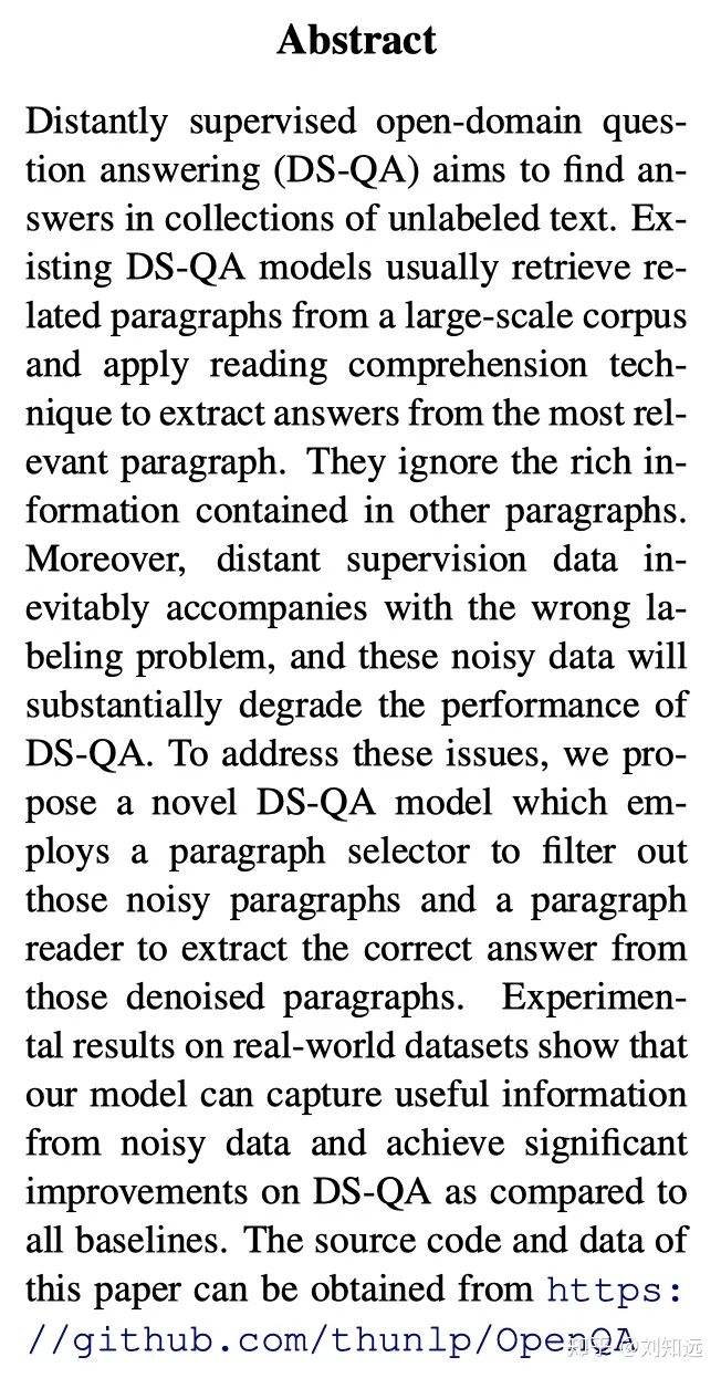 [2] Yankai Lin, Haozhe Ji, Zhiyuan Liu, Maosong Sun. Denoising Distantly Supervised Open-Domain Question Answering. ACL 2018. http://nlp.csai.tsinghua.edu.cn/~lzy/publications/acl2018_qa.pdf