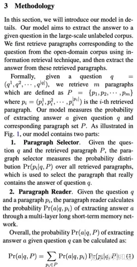 这部分起手”总“的部分要介绍本文任务的符号定义,以及本文方法的框架组成,或者按步骤来介绍或者按模块来写,让读者对本文方法有全景式的理解。如下所示论文[2]的Methodology”总“的部分,就先介绍一些符号,然后分别介绍了Selector和Reader两个模块的主要功能。