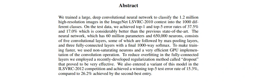- 前2句话介绍了自己做的工作,训练了一个很大很深的卷积神经网络在LSVRC-2010 contest取得了很好的结果。
