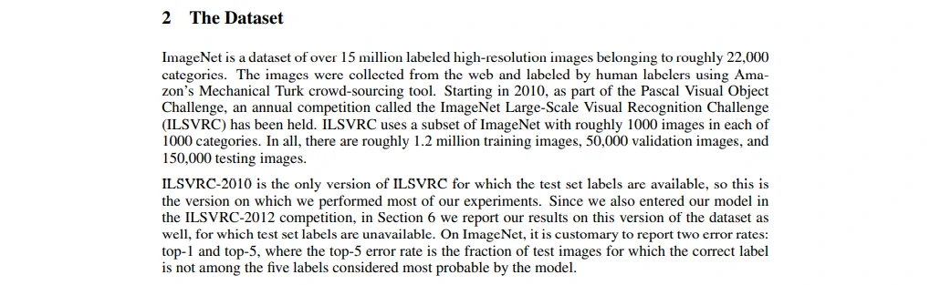 这两段话介绍了一下数据集,ImageNet很大、类别很多有22000类。这个模型参加过几次比赛,ILSVRC-2010有测试集所以看得出错误率,ILSVRC-2012就没有提供数据集,简单讲了一下摘要里那些错误率怎么来的。