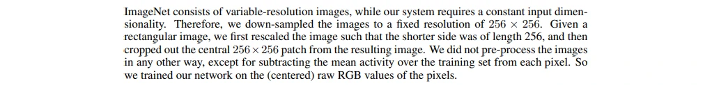 这段讲ImageNet的预处理,保证短边为256然后中心裁剪,不做其它预处理。因为ImageNet图片的大小不一,要先处理一下。