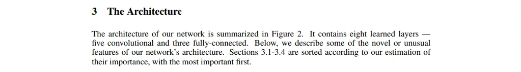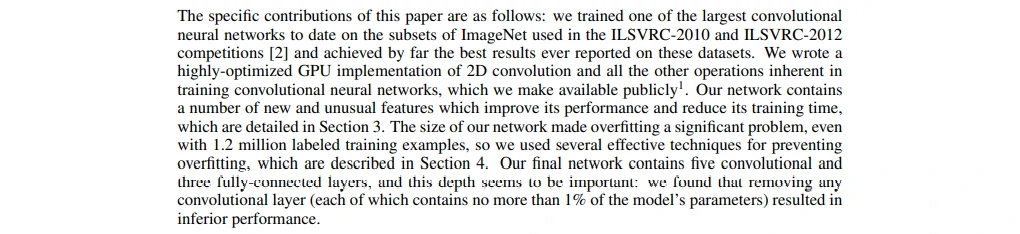 - 最后一句, 介绍在ILSVRC-2012比赛取得了第一名,错误率比第二名低了10.9%,可以看到本文设计的网络模型效果很好。