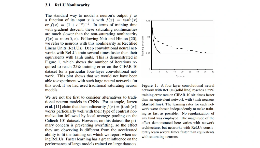 文章说用了ReLU特别好、特别快,图1也就表示出了它好的效果,随着epoch训练轮数的增加下降得更快。为什么非饱和更快,文章没有详细说明,有个引用标注,之后可以再看[20]的引用论文。