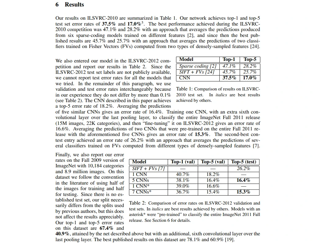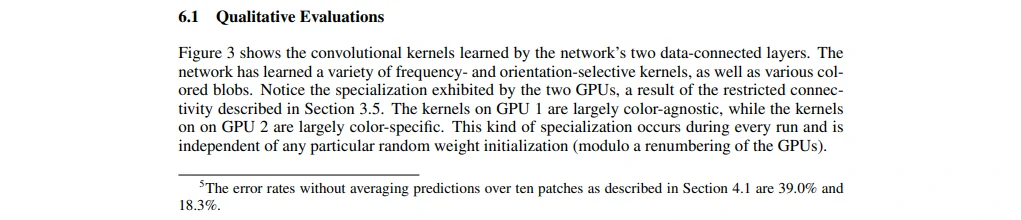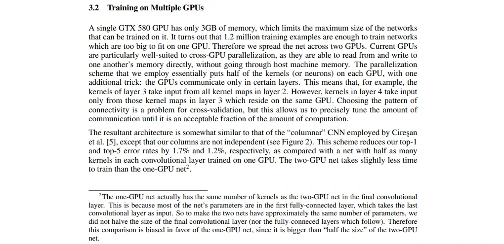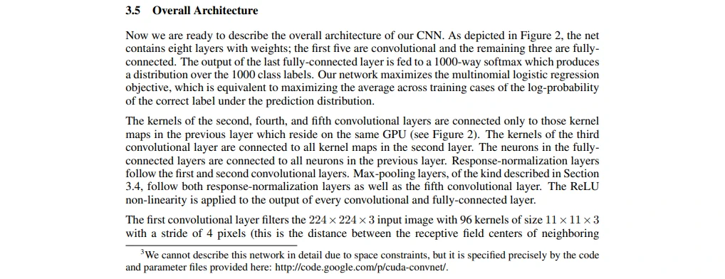 很少有人会在第一句话写我做了什么、第二句话写我做得很好,这种写法十分少见。然后他说这个神经网络有6千万个参数和65万个神经元,在当时可能还不知道什么是神经元,但对比起SVM、线性模型等参数量还是很大的。接着他说神经网络有五层,一层max-pooling、三层全连接层、最后一层softmax,在当时第一次读应该也不清楚在干什么事情。之后他说为了加快训练使用了GPU,从2007年出了CUDA库之后,在2012年GPU的使用已经比较常见了,那时候机器学习用的大部分都是matlab的gpu加速包。另外,为了减少过拟合,也用了一个dropout的方法。最后说这个模型在刷榜比赛上比第二名领先很多。这里最后说的15.3%和前面的17.0%第一眼看起来有点奇怪,但我们最后再来看看这是怎么回事。