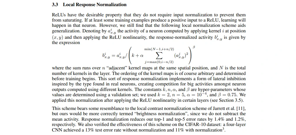 3.3 局部响应归一化(译者注:后来的研究表明,LRN几乎没有用处,因此读者可以跳过此部分)