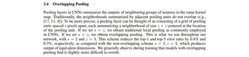 作者提到当s = 2, z = 3时,对比s = z = 2,错误率减少了0.4%(top-1) 和 0.3%(top-5)(使用重叠池化可以减少过拟合)