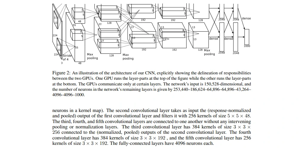 图2:我们CNN架构图解,明确描述了两个GPU之间的职责。一个GPU运行图中上面部分的层,而另一个GPU运行图下面部分的层。两个GPU只在特定的层进行通信。网络的输入是150,528维,网络剩下层的神经元数目分别是253,440-186,624-64,896-64,896-43,264-4096-4096-1000。