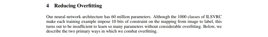 我们的神经网络架构有6000万参数。尽管ILSVRC的1000类使每个训练样本从图像到标签的映射上强加了10比特的约束,但这不足以学习这么多的参数而没有相当大的过拟合。下面,我们会描述我们用来克服过拟合的两种主要方式。