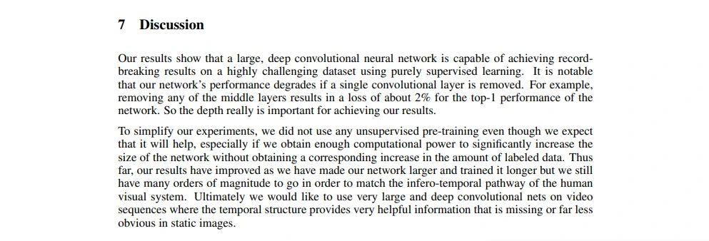 论文讨论有两段,第一段说我们在有监督学习上取得了很好的效果,证明了网络的深度很重要。第二段说我们没有使用任何的无监督预训练,这直接导致了后面的深度学习研究都集中在有监督学习上;同时作者提出未来会研究视频数据(当前研究的一个很火方向),因为视频数据会提供时序信息,这是静态图像数据所缺失的。