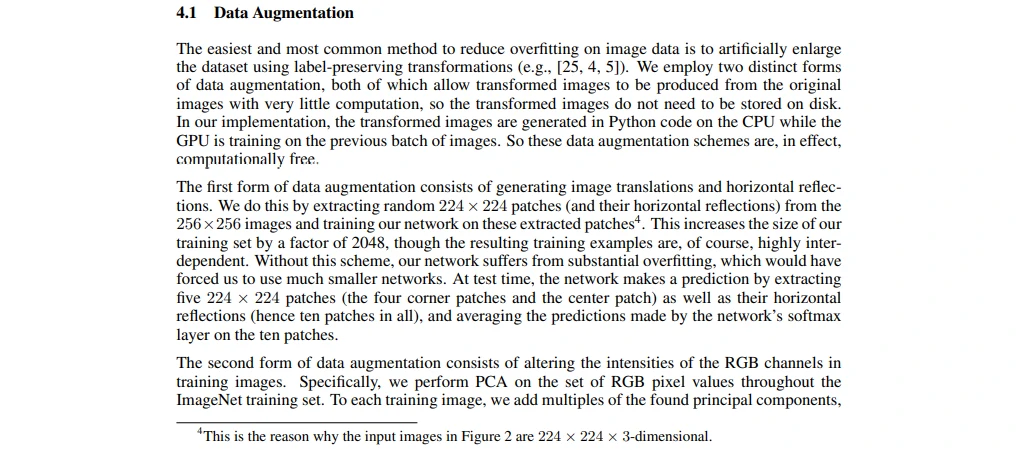 第一种数据增强方式包括产生图像平移和水平翻转。我们从256 × 256图像上通过随机提取224 × 224的图像块(以及这些图像块的水平翻转)实现了这种方式,然后在这些提取的图像块上进行训练。这通过一个2048因子增大了我们的训练集,尽管最终的训练样本是高度相关的。没有这个方案,我们的网络会有大量的过拟合,这会迫使我们使用更小的网络。在测试时,网络会提取5个224 × 224的图像块(四个角上的图像块和中心的图像块)和它们的水平翻转(因此总共10个图像块)进行预测,然后对网络在10个图像块上的softmax层的预测结果进行平均。