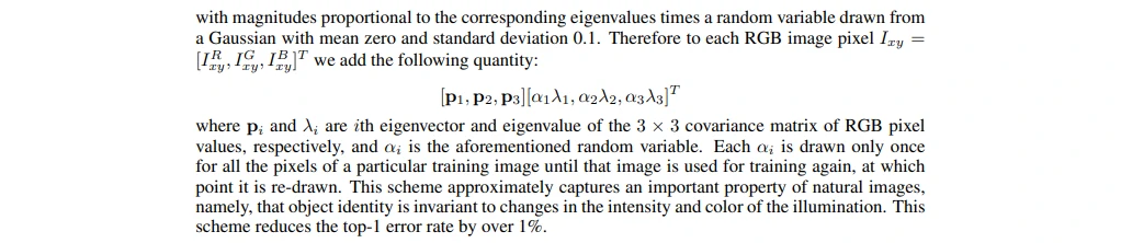pi,λi分别是RGB像素值3 × 3协方差矩阵的第i个特征向量和特征值,αi是前面提到的随机变量。对于某个训练图像的所有像素,每个αi只获取一次,直到图像进行下一次训练时才重新获取。这个方案近似抓住了自然图像的一个重要特性,即光照的强度和颜色发生变化时,物体本身没有发生变化。这个方案减少了top 1错误率1%以上。