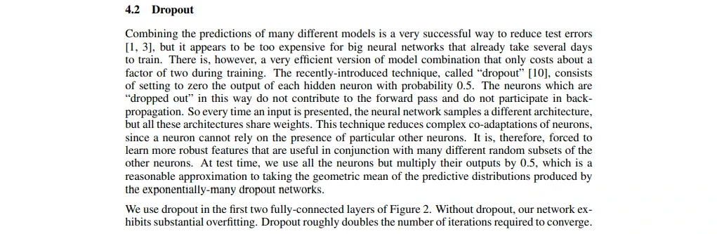 虽然说模型融合很好用,但太久了不好用。所以Alex用了Hinton老爷子在其论文《Improving neural networks by preventing co-adaptation of feature detectors》中提出Dropout,设置每次0.5的概率忽略神经元来防止过拟合,其实现在的眼光来看,dropout也不是模型融合,应该说是正则项。几年后他们也写了篇文章说dropout在线性模型中等价于一个L2的正则项,更复杂来说应该说是带来了一个正则的效果。